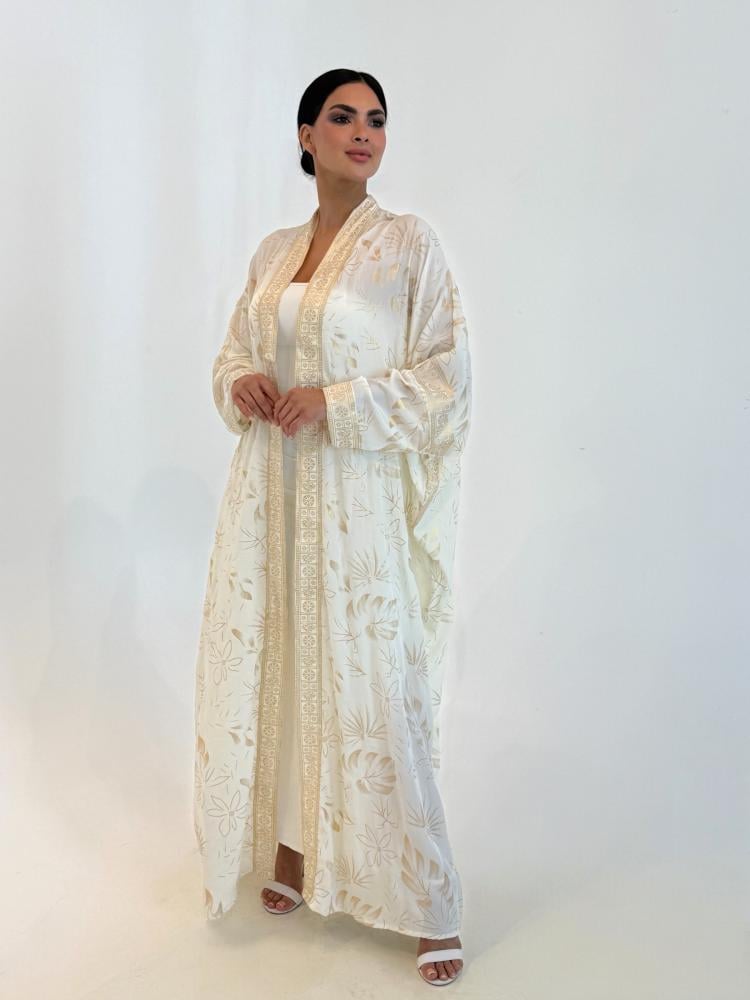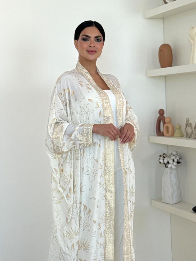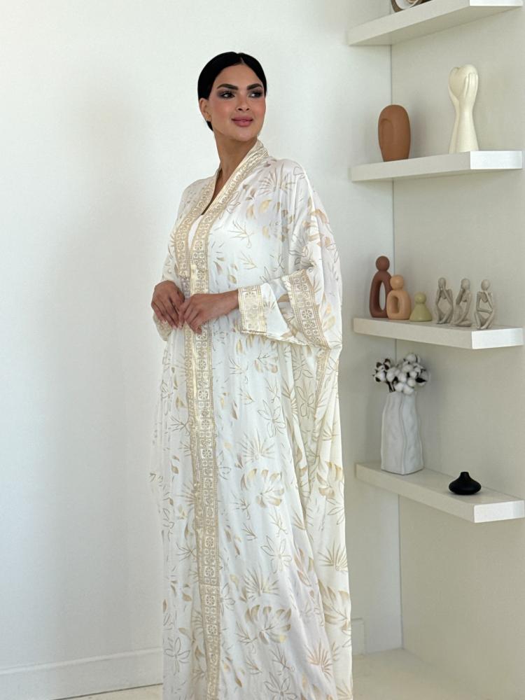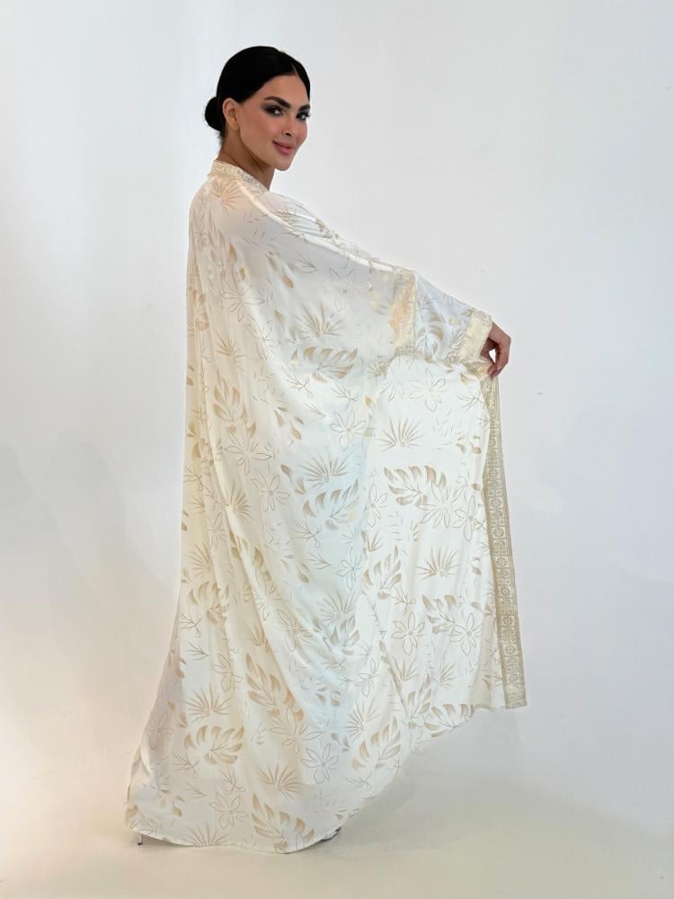 عباية بيضاء مطرزة هي قطعة الفخامة اللي تحتاجينها بمناسباتك، بياضها الناصع مع لمسات التطريز الذهبي يعطيكِ هيبة ملكية وإشراقة تخطف الأنظار، صمّمناها لتكون طلّتكِ دايم هي الأرقى والأكثر تميزاً.
