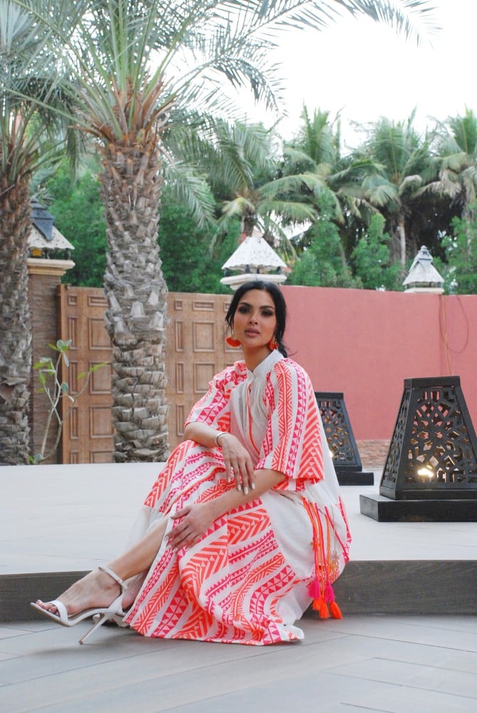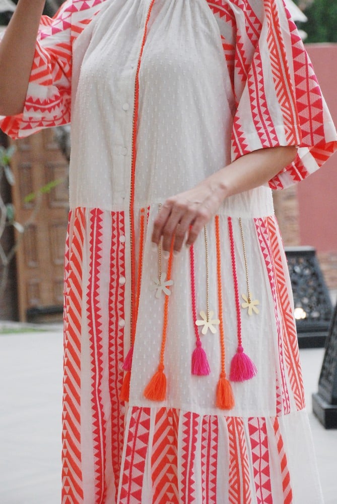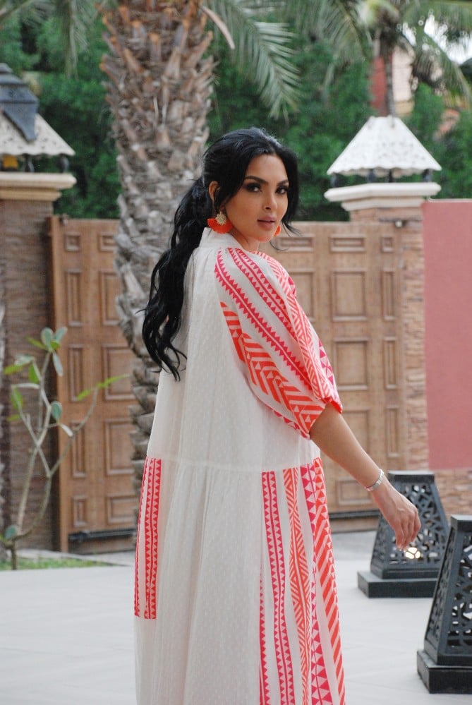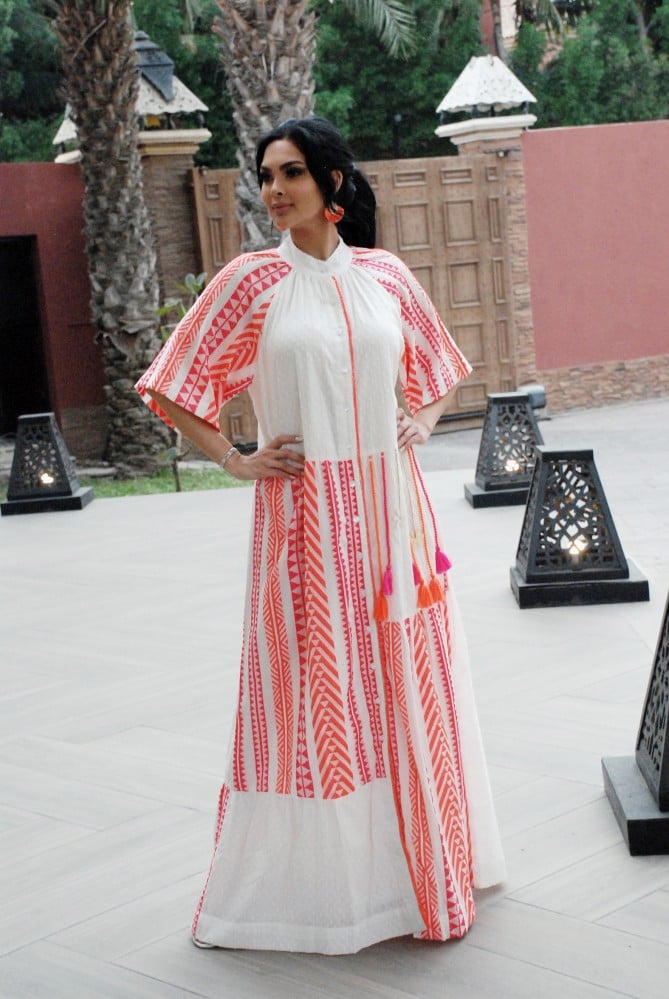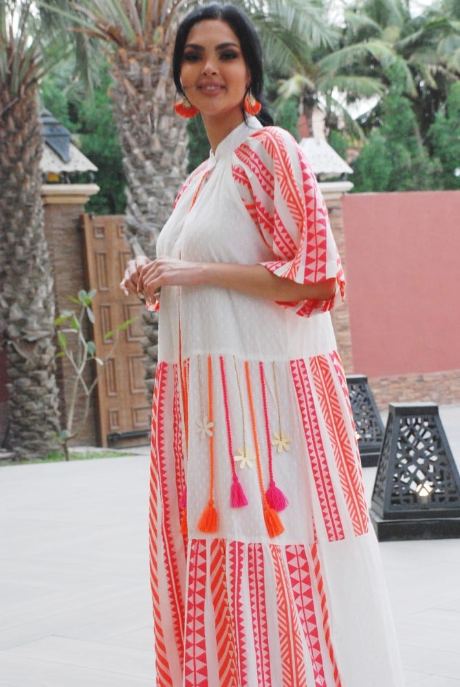 تألقي بإطلالة ساحرة مع فستان طويل و بتصميمه الأنيق ولونه الأبيض مع الأحمر الجذاب يجمع بين الأناقة والراحة و يناسب جميع المناسبات.