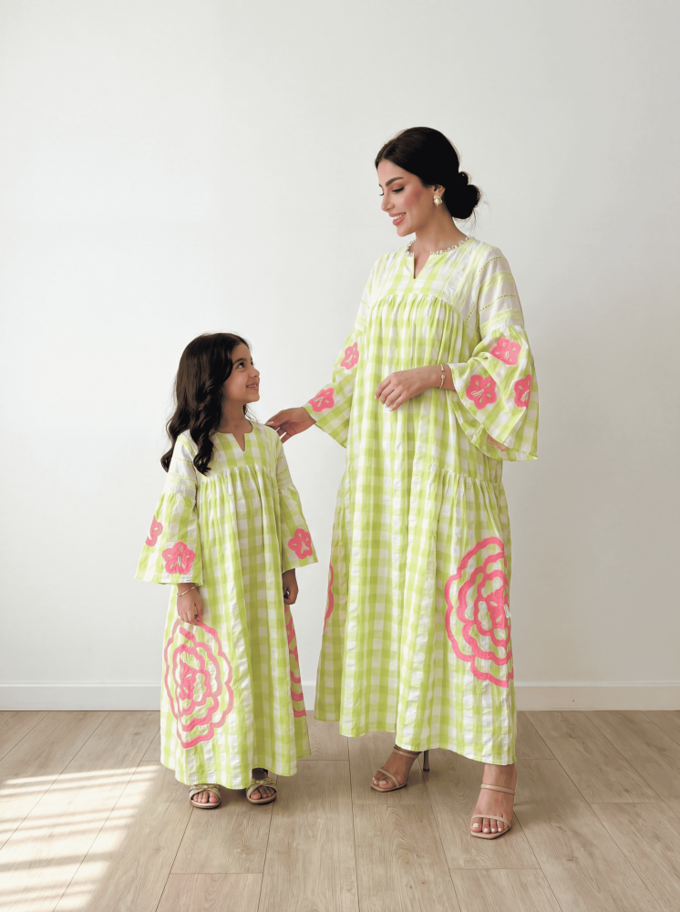 فستان ناعم هو رفيقكِ المثالي للأيام اللي تبين فيها الكشخة والراحة سوا، بياضه الناصع مع الخطوط الخضراء الباردة تعطي طلّتكِ حيوية ونعومة ما لها مثيل، وتخليكِ دايم في قمة أناقتكِ السعودية بأسلوب بسيط ومرة راقي.