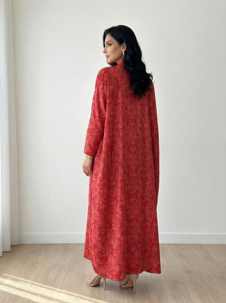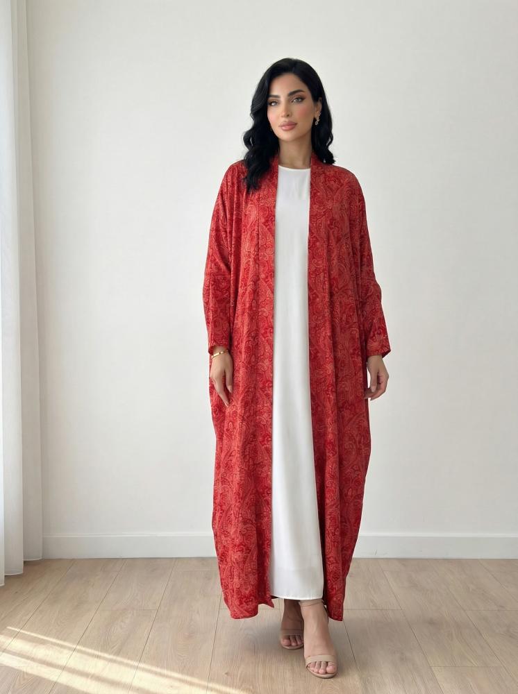 A striking abaya with an elegant design in a vibrant red color that commands attention. Its open, loose cut provides exceptional comfort and clear sophistication, making it a bold choice for a confident and feminine look.